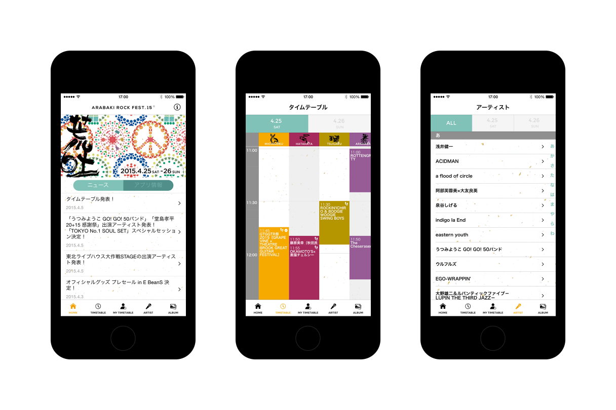 We developed the official app to enhance the experience of ARABAKI ROCK FEST.15. The app includes the following exclusive features: