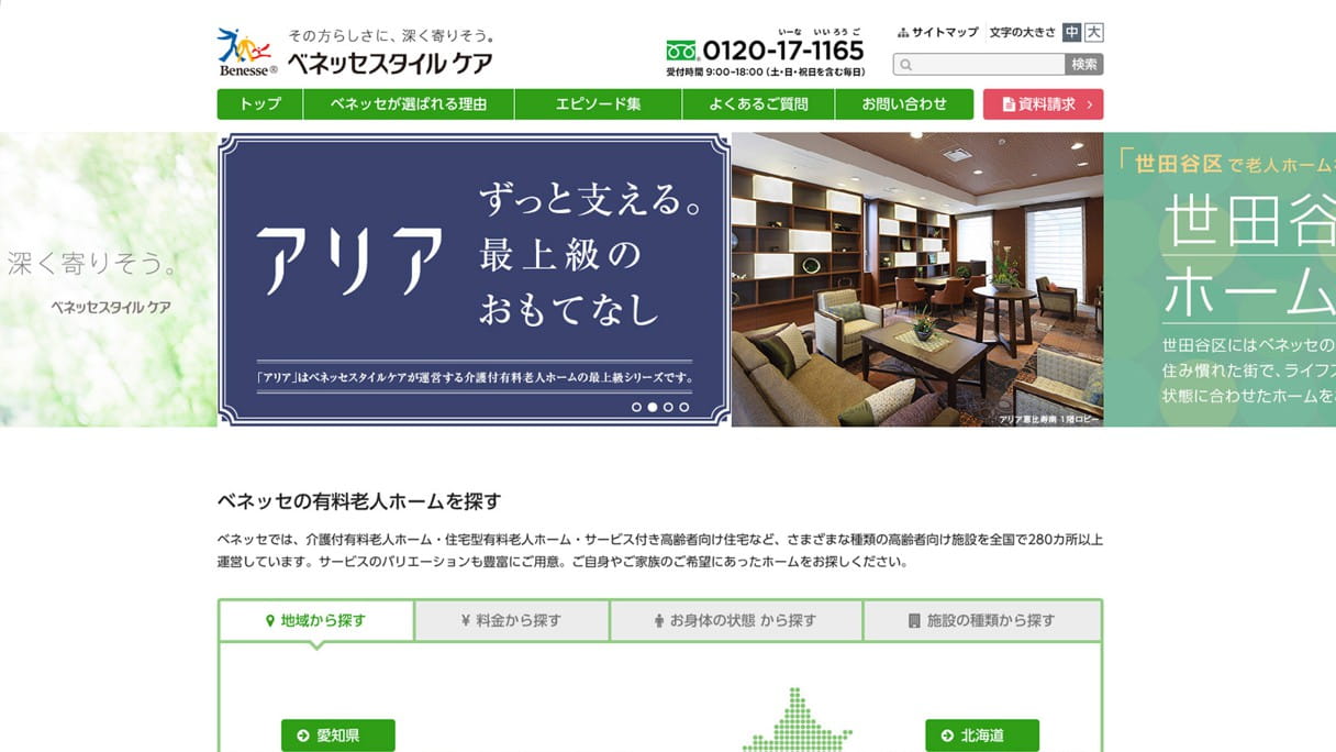 The service website for new elderly care facilities established by Benesse–Style Care.