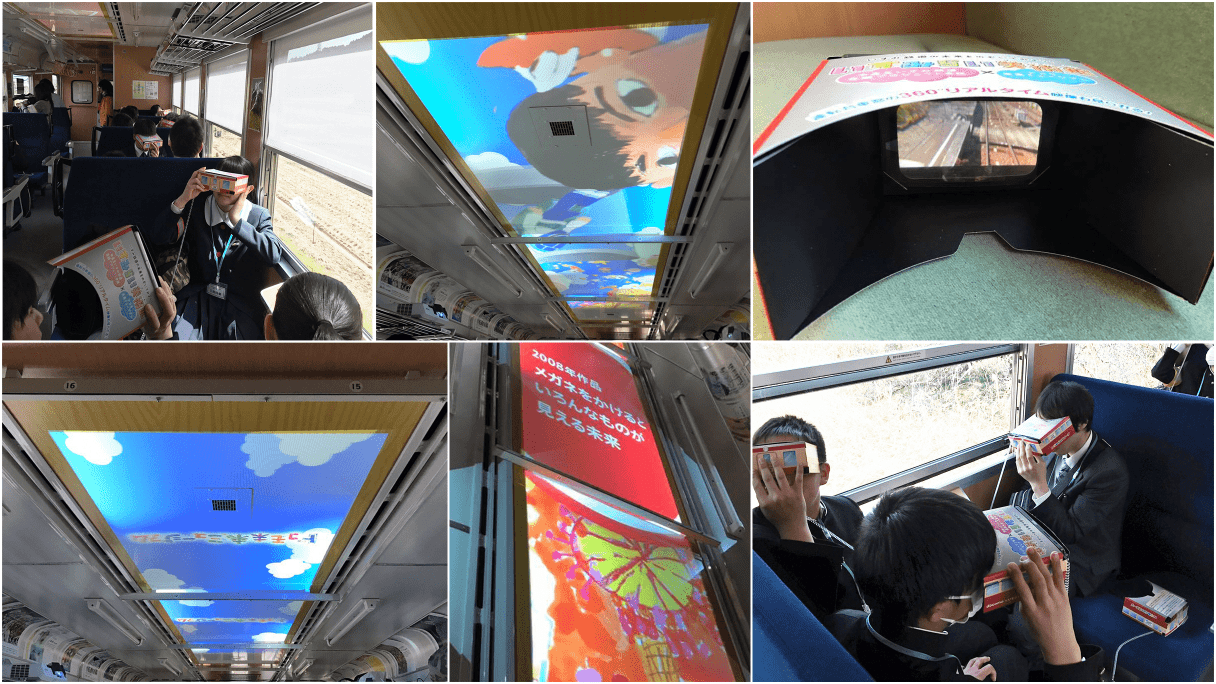 The “Docomo Future Museum,” which holds an annual children’s painting contest under the theme “Our Future Lives,” celebrated its 15th anniversary with a unique project. For the first time in Japan, they conducted a month-long 360-degree live stream from a moving train. A 360-degree camera was installed in the driver’s seat, allowing viewers to enjoy the beautiful scenery along the railway as if they were the driver. The project also featured children’s paintings and copywriting works collected from workshops, overlaid on the scenery. Additionally, projection mapping was held on the train’s ceiling, showcasing videos of past children’s drawings, with the ceiling representing the blue sky.