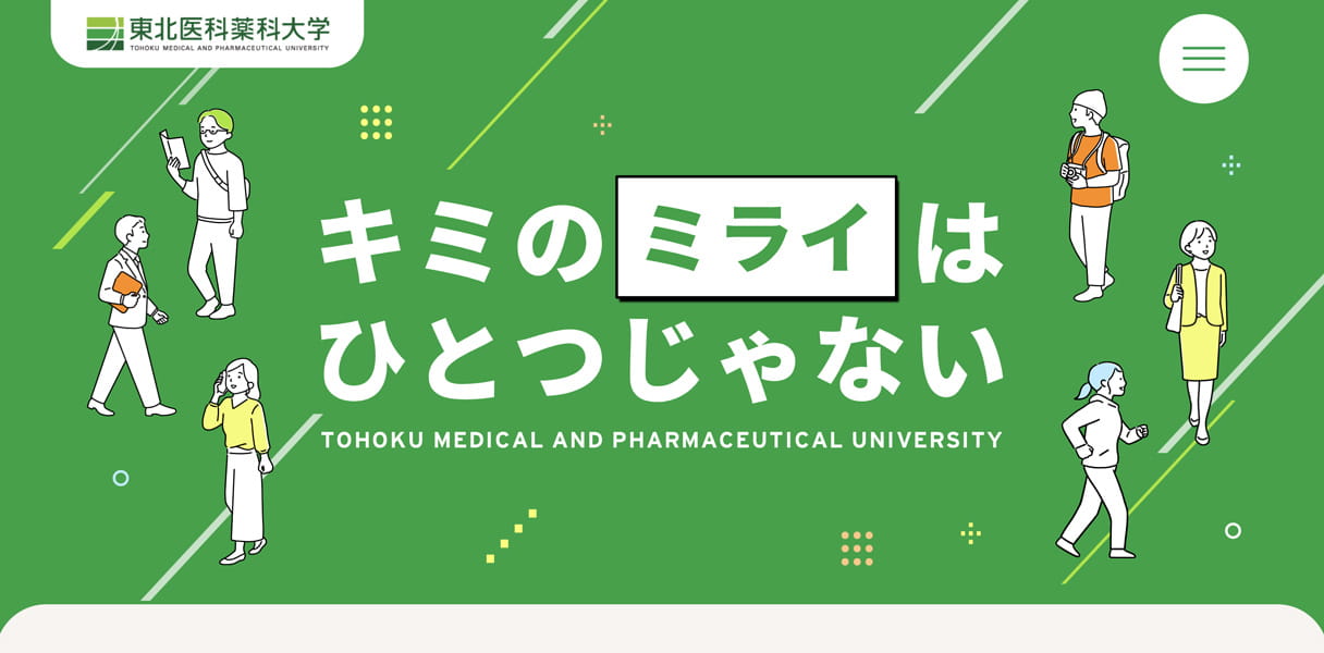 薬学部の学びは薬剤師だけではなく、様々な業界・職種に活かせることを卒業生への取材を通して、ご紹介する特設サイトとなります。メインターゲットである中高生を意識し、イラストや装飾で明るくポップで楽しい雰囲気を出しながら、濃いグリーン系でアクセントをつけて、砕けすぎないデザイン設計としました。